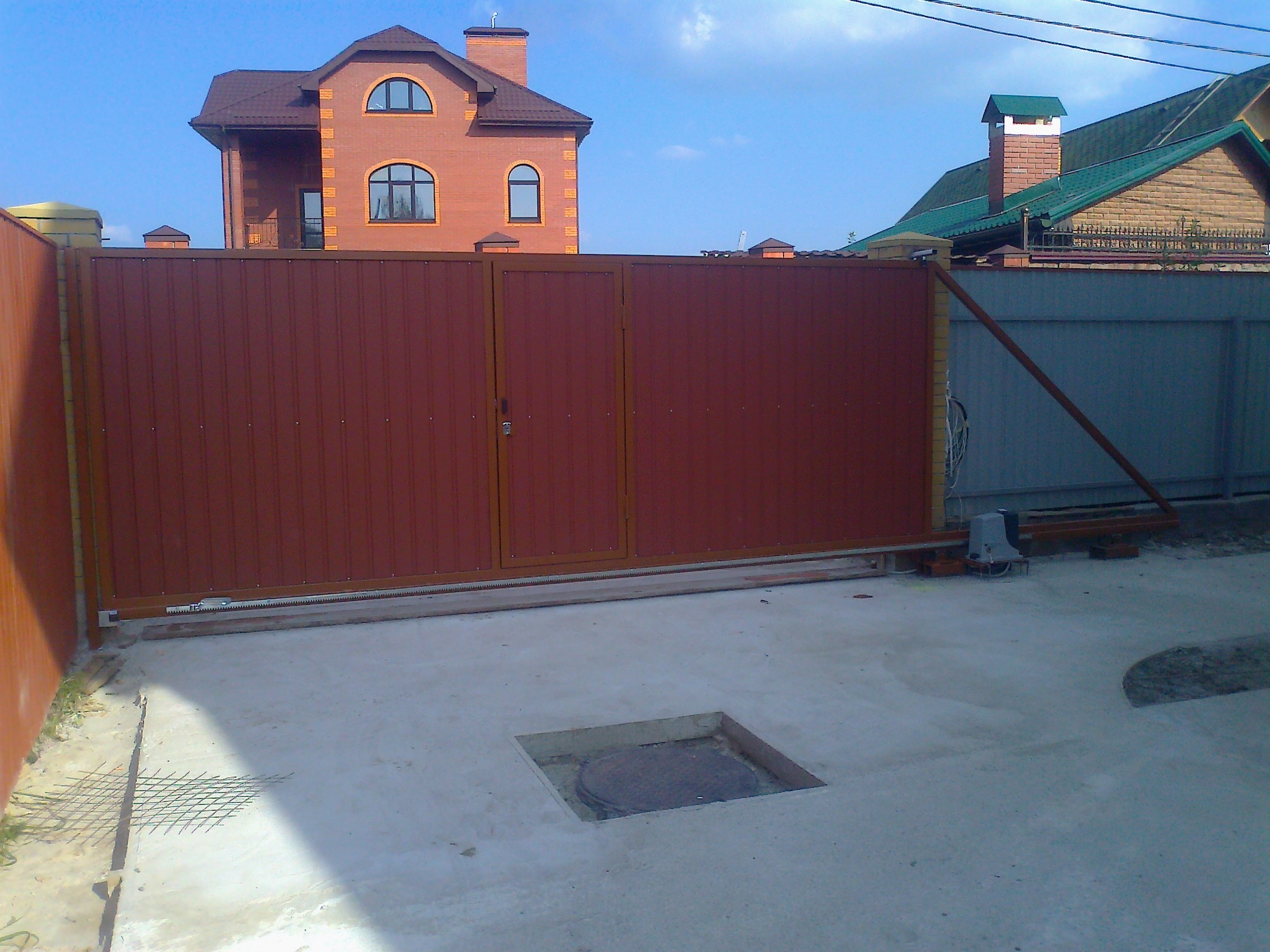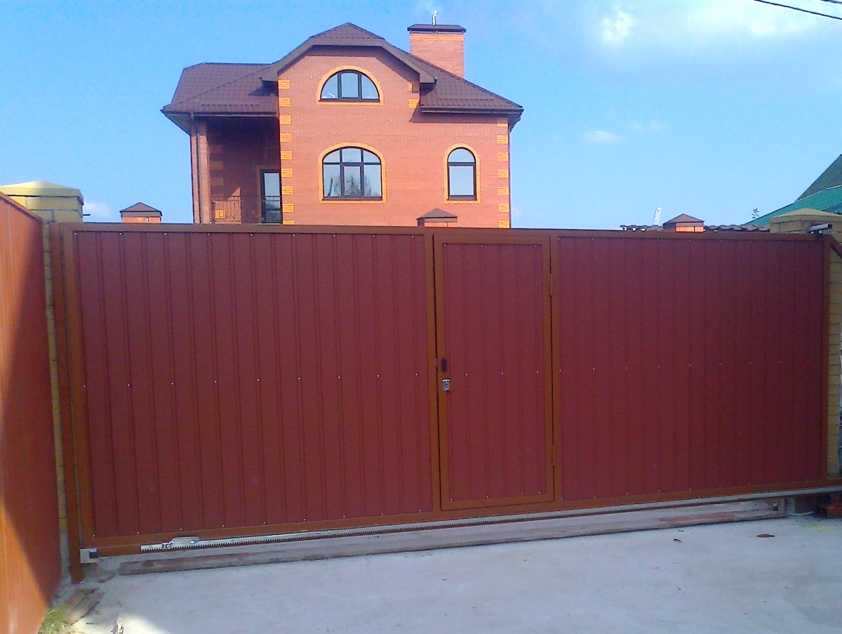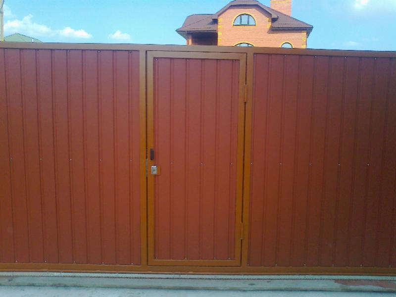 Откатные ворота со встроенной калиткой. Зашивка профлист, цвет "терракот"