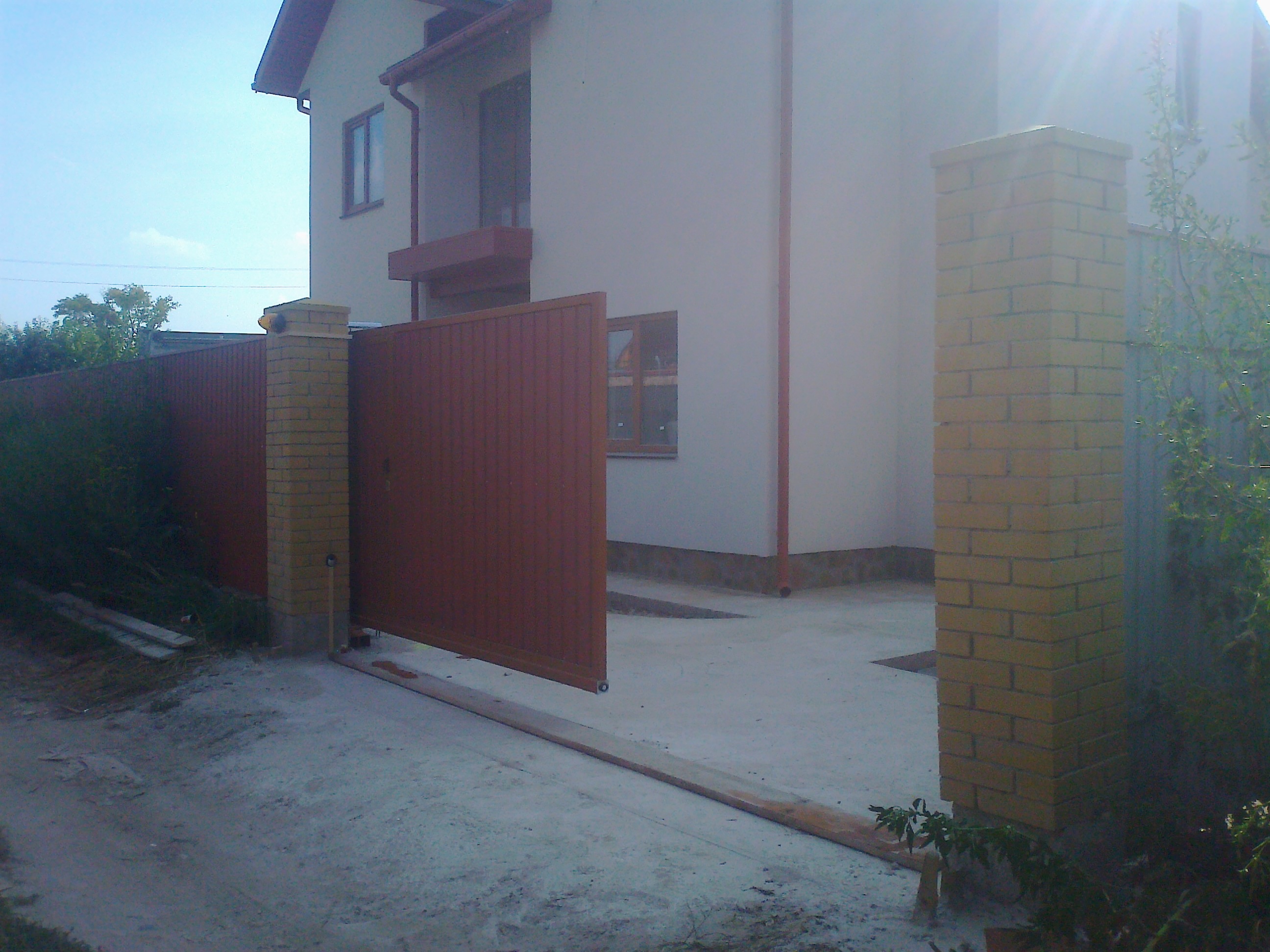 Все мы знаем район Осокорки с ихними дачными участками и узкими дорогами. На данном участке нет места для установки отдельно стоящей калитки. Вышли с положения, изготовив откатные ворота со встроенной калиткой.